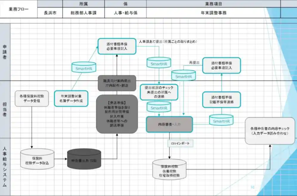 服部さん:私が人事課へ異動になって以降、他の職員とともに幅広く人事労務業務に携わるようになりました。その中でもとくに、年末調整や社会保険の加入手続きが煩雑で職員負担も大きいと感じたため、解決策を模索し始めたのがキッカケです。