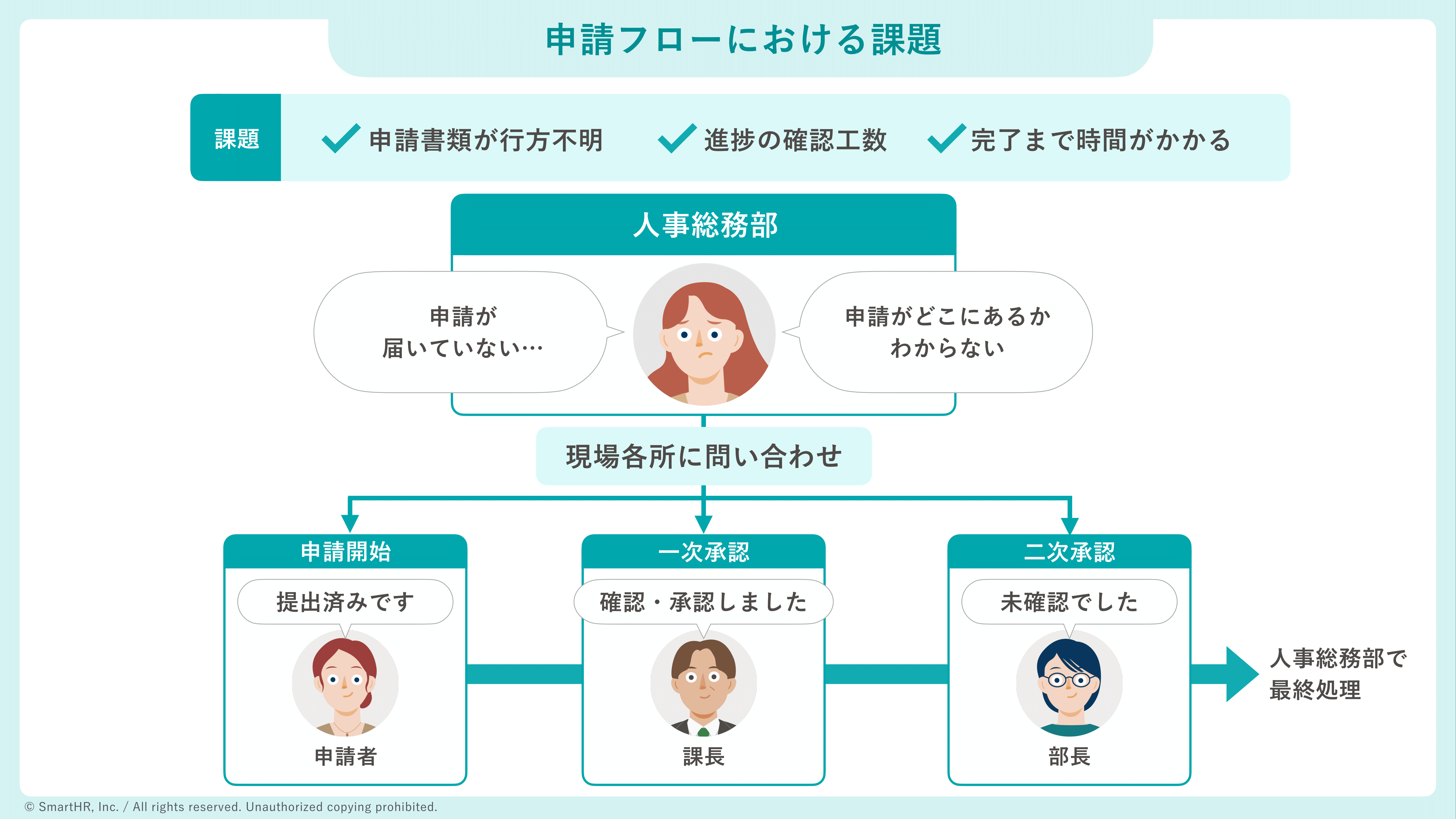 - 紙・表計算ソフト・社内便による申請フローで、承認まで最大1か月かかる