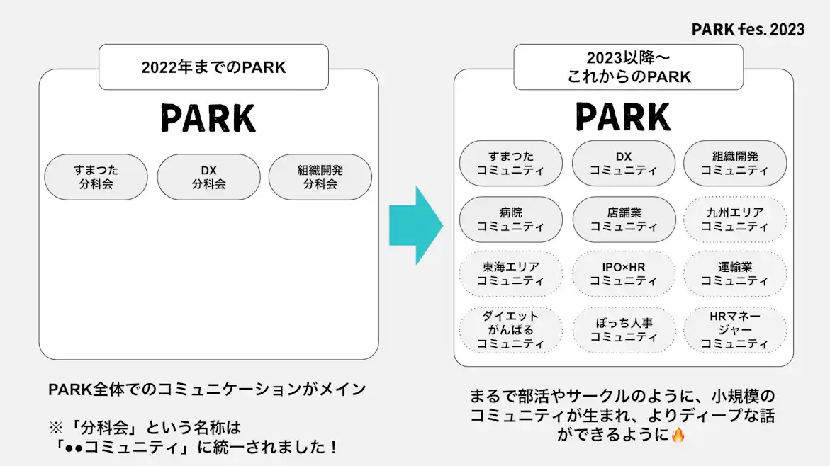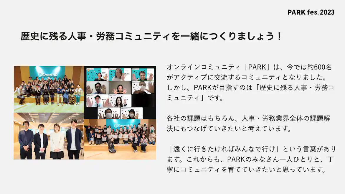 PARK fes.は年に1度のお祭り。お祭りで得たつながりや知見を、日頃の業務に活かしていただけたらと思います。PARKは23年の7月に正式オープンした、まだまだこれからのコミュニティです。PARKメンバーのみなさん一人ひとりと共に、歴史に残る人事・労務コミュニティを目指していけたらと思いますので、よろしくお願いします!