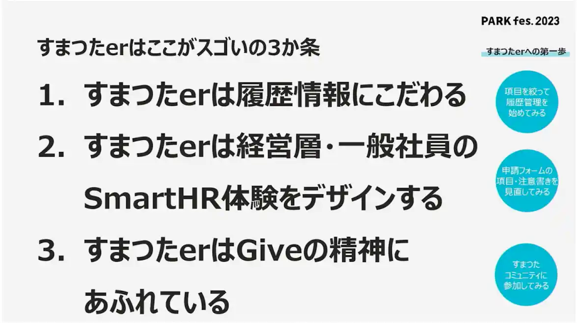SmartHRを使いたおす会社はここがすごい!の3か条|PARK すまつたコミュニティ【PARK fes.2023イベントレポート】