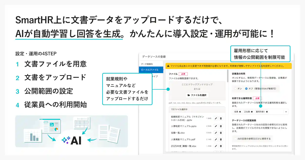 また、文章ファイルごとに雇用形態に応じた情報公開範囲を設定できるため、情報を安全に取り扱えます。アップロードされた情報は、各企業のSmartHR環境内でのみ利用され、外部のAIシステムの学習には使用されないため、機密情報も安心して活用できます。