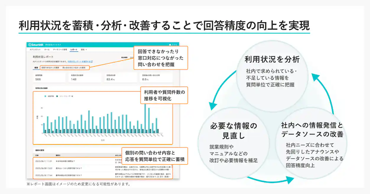 AIアシスタントは単に回答するだけでなく、問い合わせデータを収集・可視化する機能も備えています。どのような質問が多いか、どの部署からの利用が多いかなどの情報をレポートで確認できるため、従業員のニーズを正確に捉えられます。