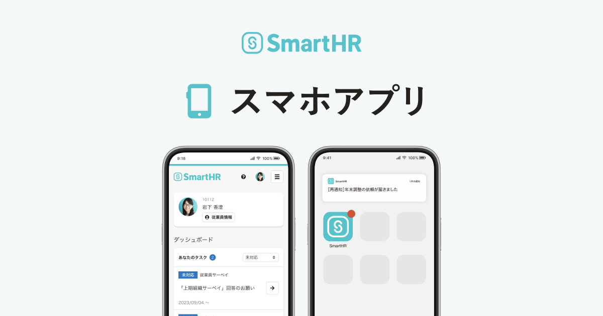 社用パソコンやメールアドレスを所持していない従業員でもログインできる、SmartHRのスマートフォン向けアプリです。プッシュ通知が届くので、働き方や契約形態を問わず情報を見逃しづらくなります。場所・時間を選ばずに、様々な手続きをスマホで行えます。