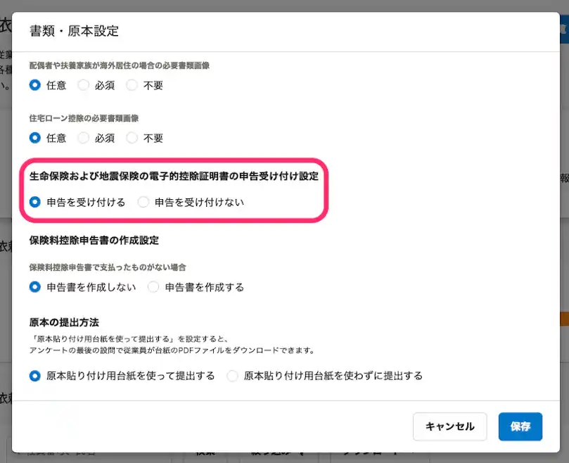 SmartHR年末調整機能にて、[依頼グループ設定▼]>[書類・原本設定]の[生命保険および地震保険の電子的控除証明書の申告受け付け設定]で[申告を受け付ける]を選択。