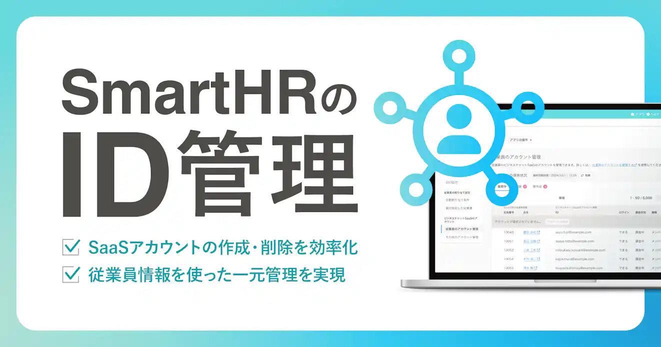 人事・労務と情シスの連携を強化!SmartHRの「ID管理」機能で、入社時のアカウント発行・削除やSaaS管理の課題を解決し、企業全体の安全なアカウント管理体制と業務効率化を両立させます。2025/05/20
