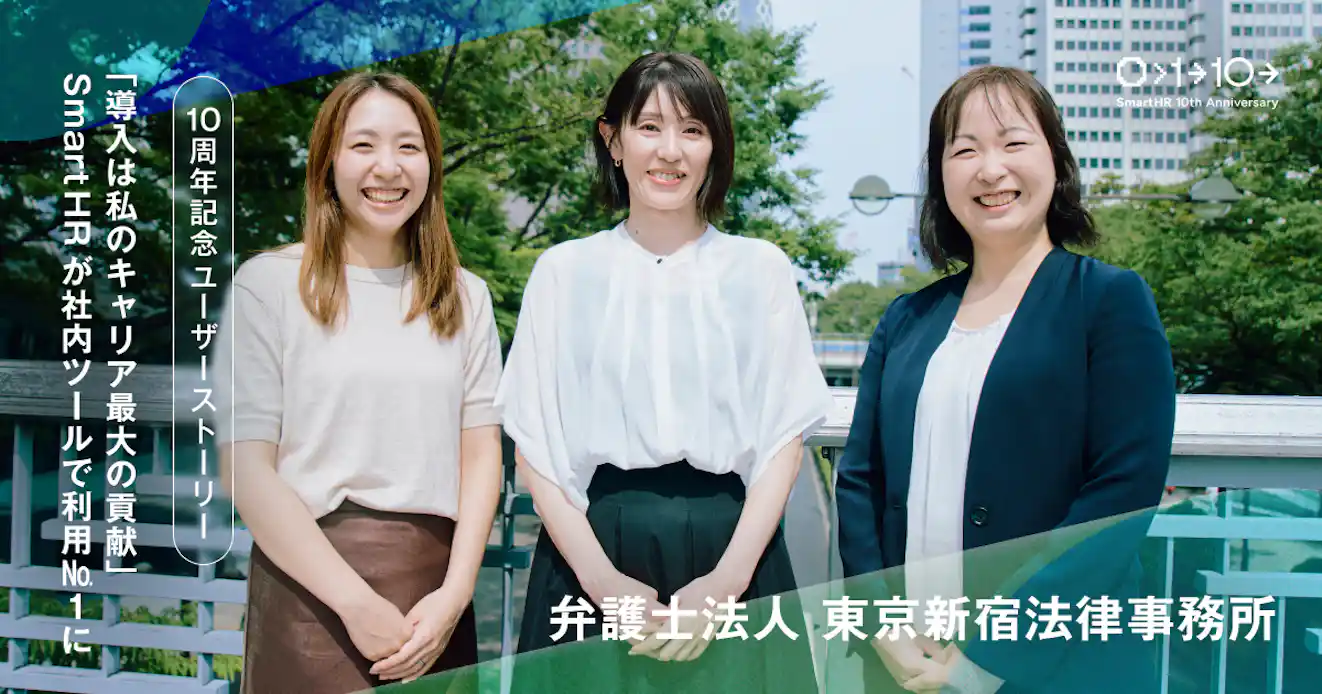 弁護士法人東京新宿法律事務所は、2009年の開設以来、交通事故や労働問題、借金問題、B型肝炎、ネットトラブルなど、幅広い案件に対応してきました。「100年後も続く企業になる」「お客さまにとってNo.1の法律サービスブランドになる」をモットーに、組織規模を拡大しています。そんな事務所の成長を内側から支えているのが、総務経理部 人事労務課です。2018年、従業員の情報を効率的に管理するためSmartHRを導入。今では事務作業の効率化だけでなく、従業員のヘルスケアにもSmartHRを役立てています。今回は、導入を推進した同課の染谷美紀さん、堀内亜砂子さんにインタビュー。カスタマーサポートの西條が、導入に至るまでの経緯や具体的な活用方法についてお伺いします。2025/09/25